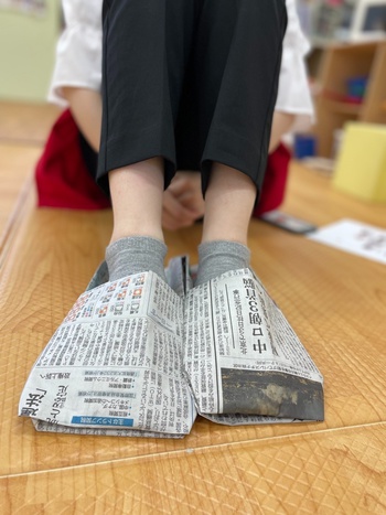 坂出市危機管理課の方をお招きして『新聞スリッパの作り方』を教えていただきました。