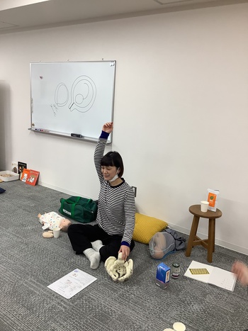 今回は、テーマを決めず、助産師さんに聞きたい事を質問したり、助産師さんから赤ちゃんの出産時の様子や妊娠期に知ってためになる姿勢の話や温活のススメのお話がありました。