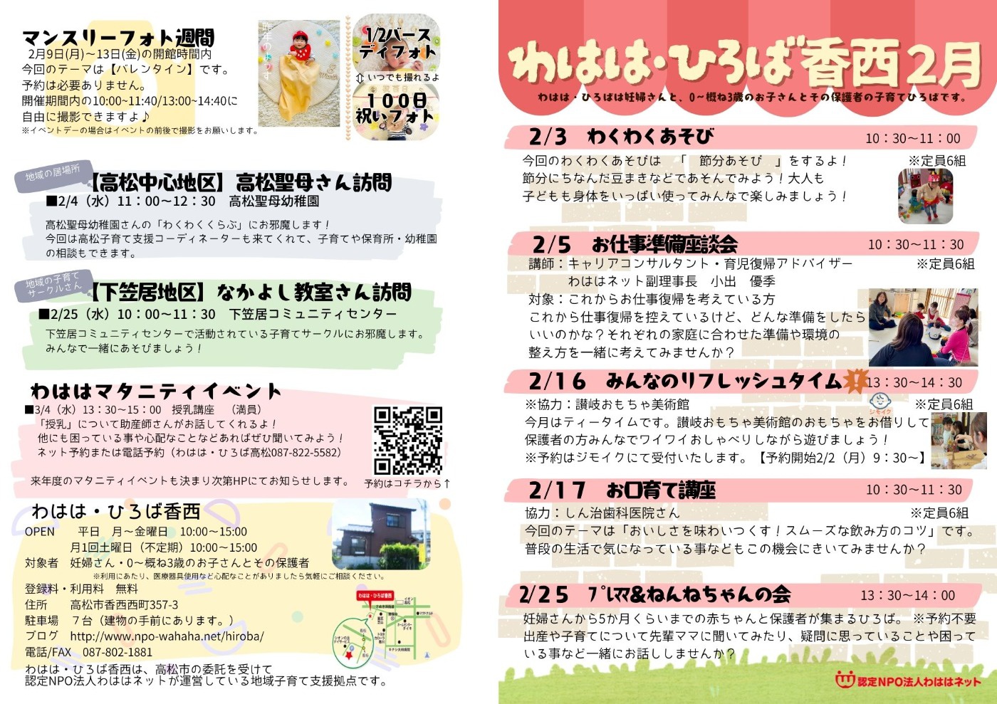 高松市役所(6F子育て支援課、1F市民サービスセンター、国分寺支所)高松市保健センター、香川県庁、勝賀保健ステーション、コミュニティーセンター(香西、下笠居、弦打、鬼無)、高松ミライエ(高松男女共同参画センター、たかまつファミリー・サポート・センター、託児室)、高松市立図書館 (サンクリスタル)、国分寺図書館、国分児童館、新居東児童館、柏原児童館、コープ香西、コープ扇町、マルナカ郷東店、マルナカ鬼無店、よつばウィメンズクリニック、住谷小児科、まさだ皮膚科、まつもと眼科、西高松キッズクリニック、菓匠 芝山、イオン内ひまわり、産直フルーツの里、あそvivaぶんぶん、さぬきこどもの国、ごうとう薬局、さくら薬局、亀水運動センター、美術館診療所、オカウチAPI、きいの助産院、わはは・ひろば高松、まろっ子ひろば
