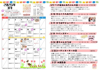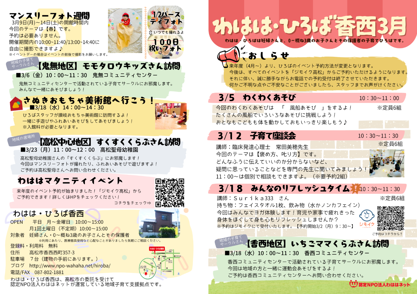 高松市役所(6F子育て支援課、1F市民サービスセンター、国分寺支所)高松市保健センター、香川県庁、勝賀保健ステーション、コミュニティーセンター(香西、下笠居、弦打、鬼無)、高松ミライエ(高松男女共同参画センター、たかまつファミリー・サポート・センター、託児室)、高松市立図書館 (サンクリスタル)、国分寺図書館、国分児童館、新居東児童館、柏原児童館、コープ香西、コープ扇町、マルナカ郷東店、マルナカ鬼無店、よつばウィメンズクリニック、住谷小児科、まさだ皮膚科、まつもと眼科、西高松キッズクリニック、菓匠 芝山、イオン内ひまわり、産直フルーツの里、あそvivaぶんぶん、さぬきこどもの国、ごうとう薬局、さくら薬局、亀水運動センター、美術館診療所、オカウチAPI、きいの助産院、わはは・ひろば高松、まろっ子ひろば
