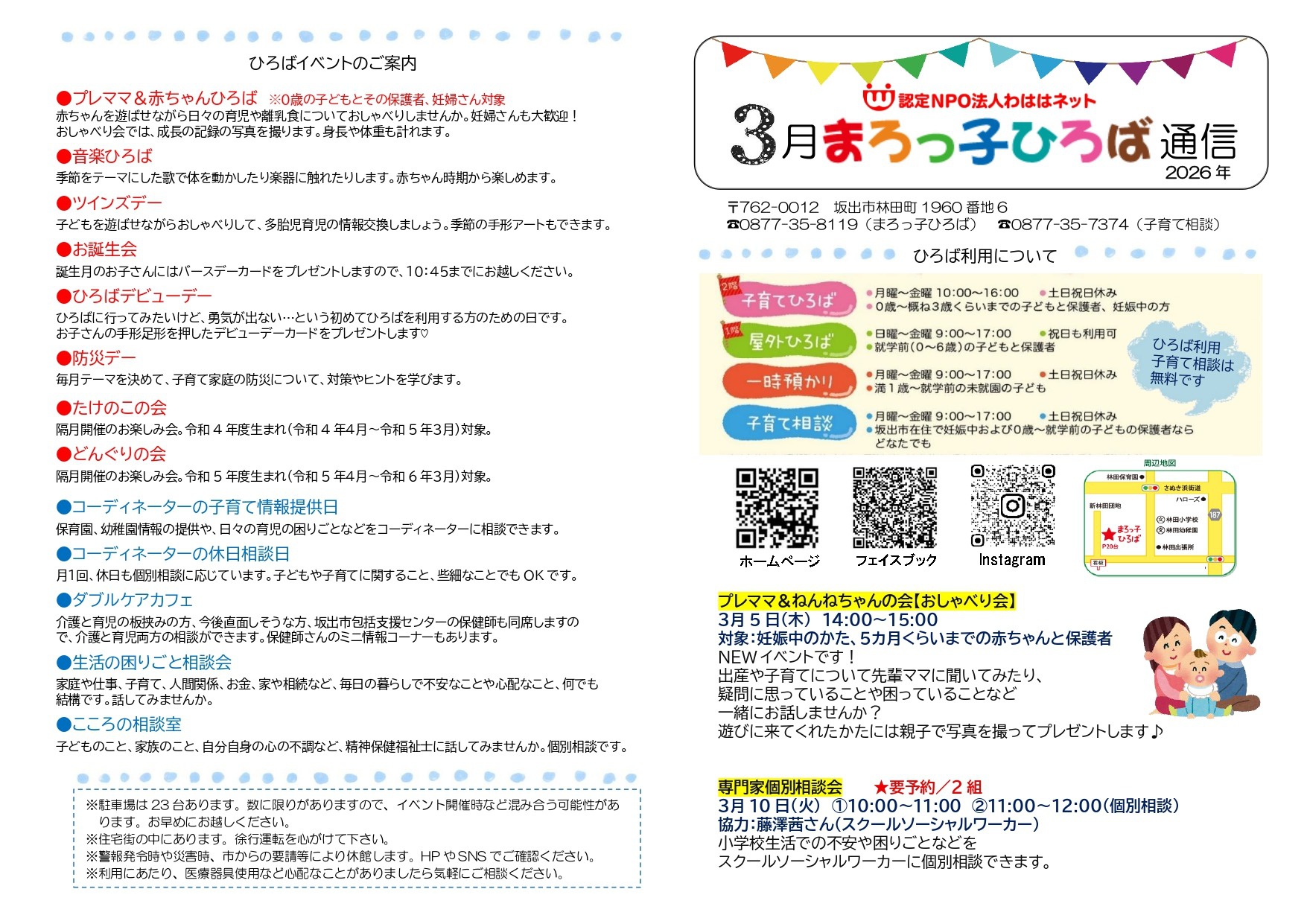 さぬきこどもの国、はぐはぐランドうたづ、神愛館、あそvivaぶんぶん、国分寺支所、国分寺図書館、新居東児童館、新名柏原児童館、国分児童館、イオン坂出店、イオンタウン宇多津、ハローズ林田店、ユープラザ宇多津、スーパーセンター宇多津、ビッグ国分寺など(順不同)