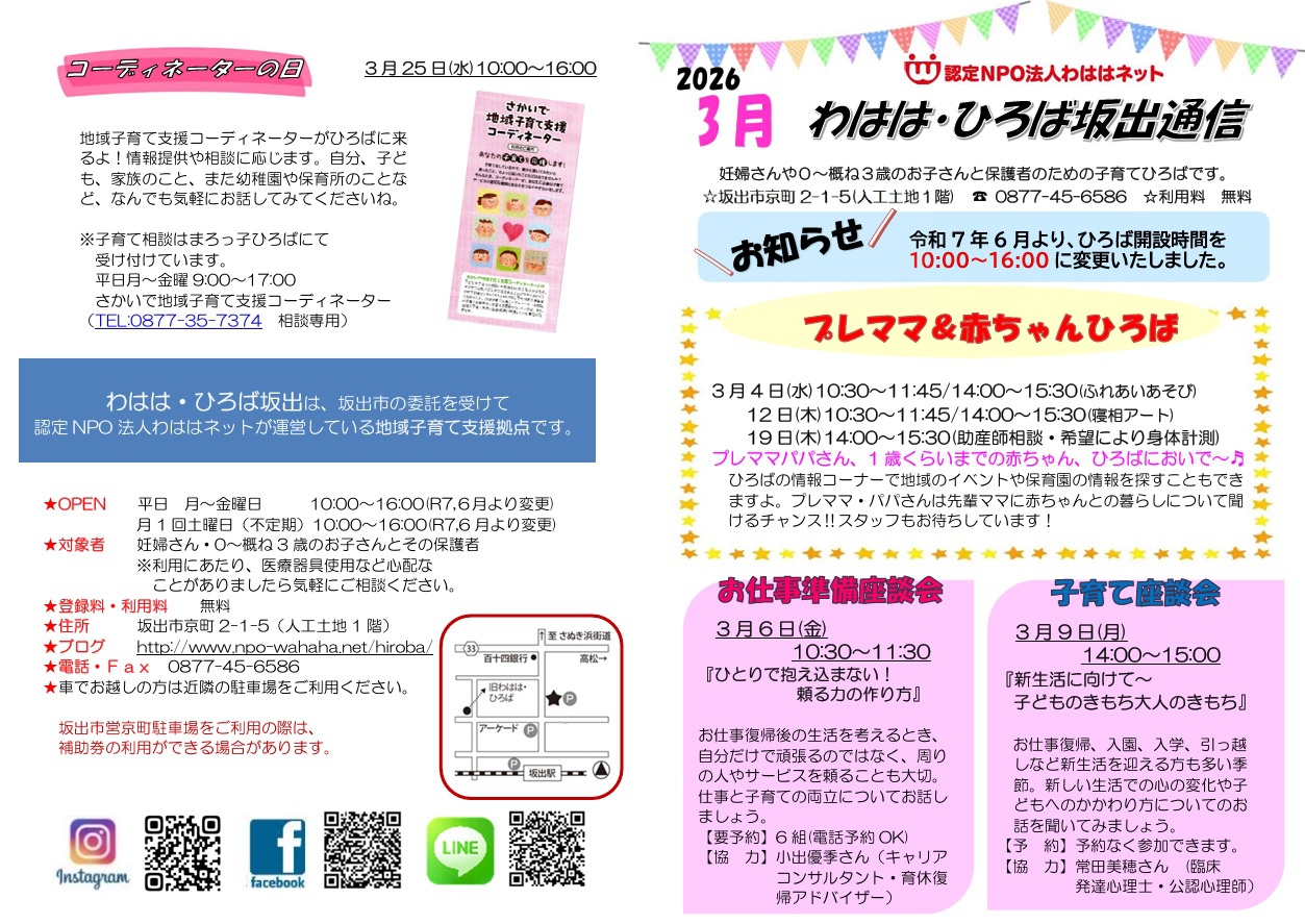 坂出市役所こども課/けんこう課・坂出市保健センター・大橋記念図書館・勤労福祉センター・坂出市社会福祉協議会・さぬきこどもの国・香川県庁・きんか子育てふれあい教室・坂出子育てふれあいセンター・友愛館・回生病院産婦人科小児科・聖マルチン病院小児科・うちだ小児科・フレンド調剤薬局駅前店・マツイ薬局・ふじみ調剤薬局・増田ニコニコ庵・イオン坂出店・ユープラザうたづ・イオンタウン宇多津・コープ坂出・高尾医院調剤薬局・坂出駅・坂出駅内観光協会・みのる接骨院・あきやま歯科・香川短期大学付属幼稚園・青山幼稚園・南部すくすくスクエア・ごうだおとなこども歯科・まろっこひろばなど (順不同、敬称略)