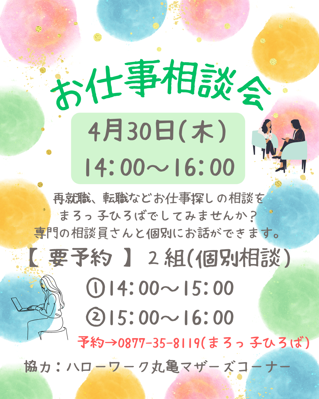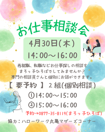 【イベント告知:まろっ子】お仕事相談会 2026年04月09日 | さかいで子育て支援センターまろっ子ひろば ハローワーク丸亀マザーズコーナーにご協力いただき、お仕事相談会を行います。 ○日時:4月30日(木)①14:00~15:00 / ②15:00~16:00(個別相談) ○要予約:2組 0877-35-8119(まろっ子ひろば) 専門の相談員さんとの個別での相談なので、じっくりお話をすることができますよ☆ 今すぐでなくても、これから再就職や転職を考えたいと思っている方も、ぜひご参加くださいね!