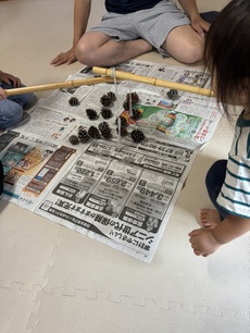 そして、アウトドアを専門とした講師による松ぼっくりを使った遊びが紹介され親子で一緒に遊んでいただきました!