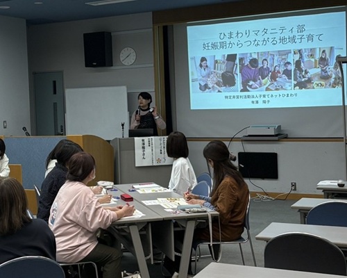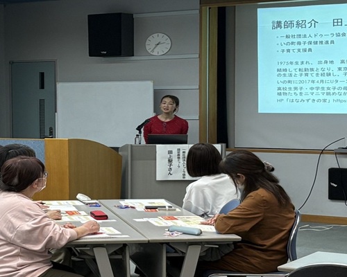 講師には一般社団法人ドゥーラ協会認定産後ドゥーラの田上聖子さんをお迎えし、「産前産後からの地域とのつながりの必要性 居場所での心身のケア」をテーマにご講演いただきました。産前産後の母親の心身の変化や寄り添い方について学び、傾聴や相手の価値観を理解する姿勢の大切さが共有されました。