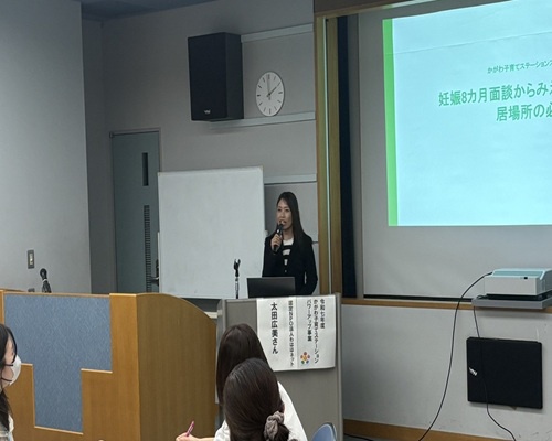 事例発表では、NPO法人子育てネットひまわりの有澤さんとまろっこひろばの太田より、妊娠期から産後までを見据えた地域子育て支援の取組が紹介されました。妊婦を地域支援へつなぐ取組や行政と連携した支援体制が紹介され、切れ目のない支援の重要性が述べられました。