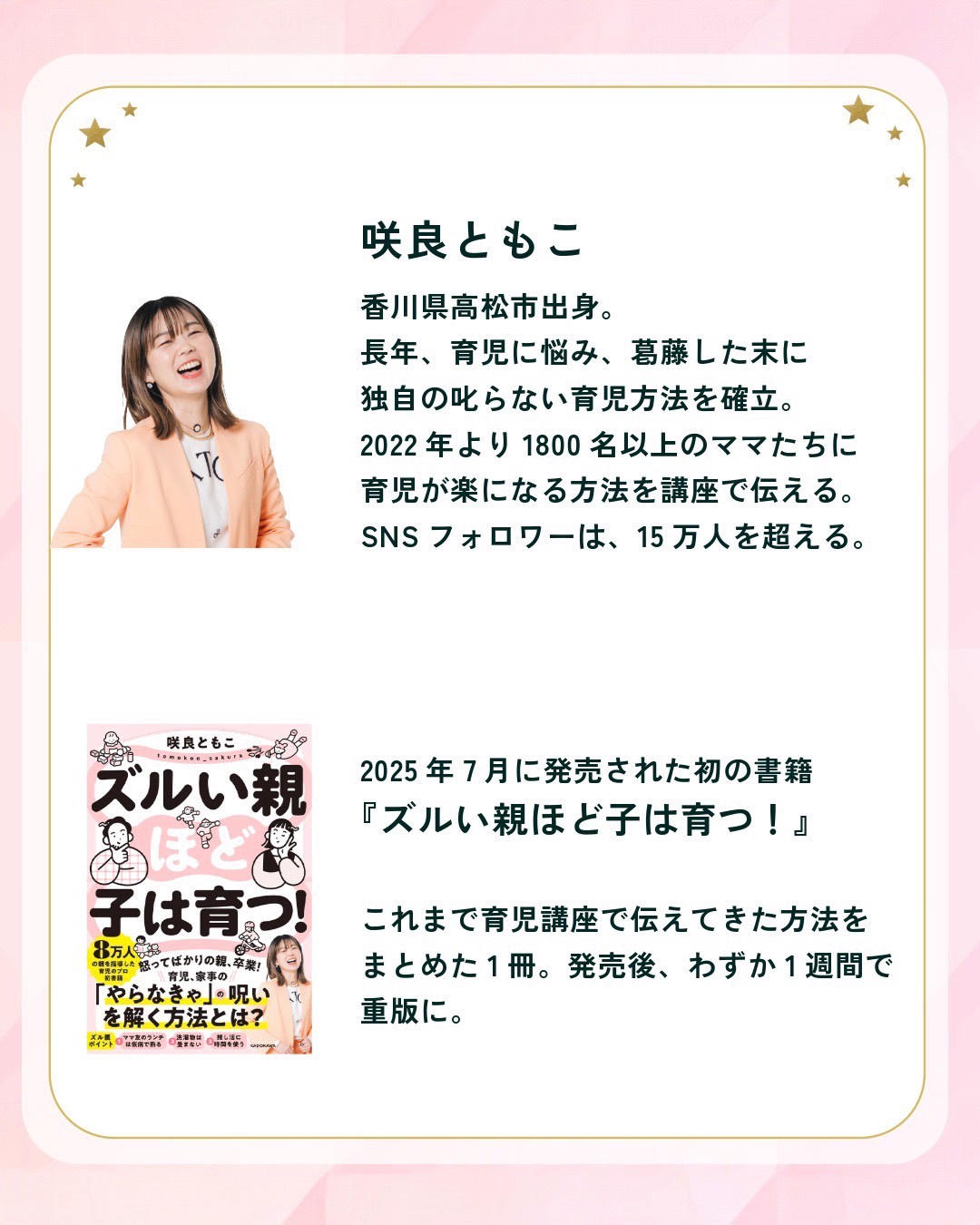 香川県高松市出身で “叱らない育児”の専門家として全国で活動する 咲良ともこさん が、新刊『ズルい親ほど子は育つ!』の出版を記念して、出身地である高松で特別イベントを開催します。