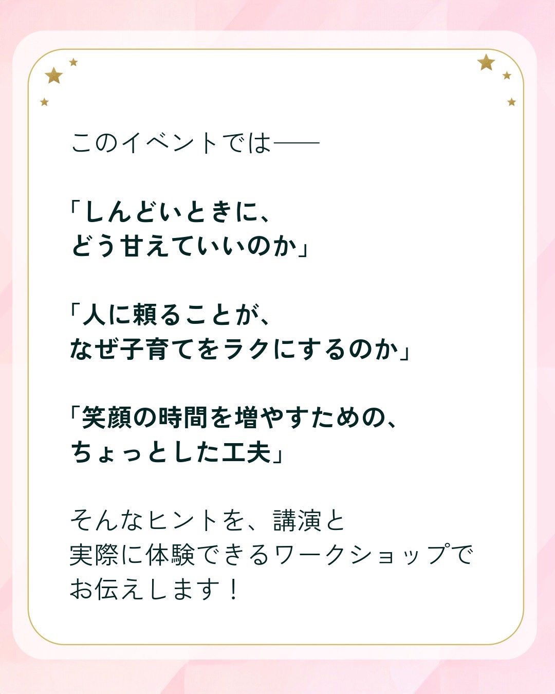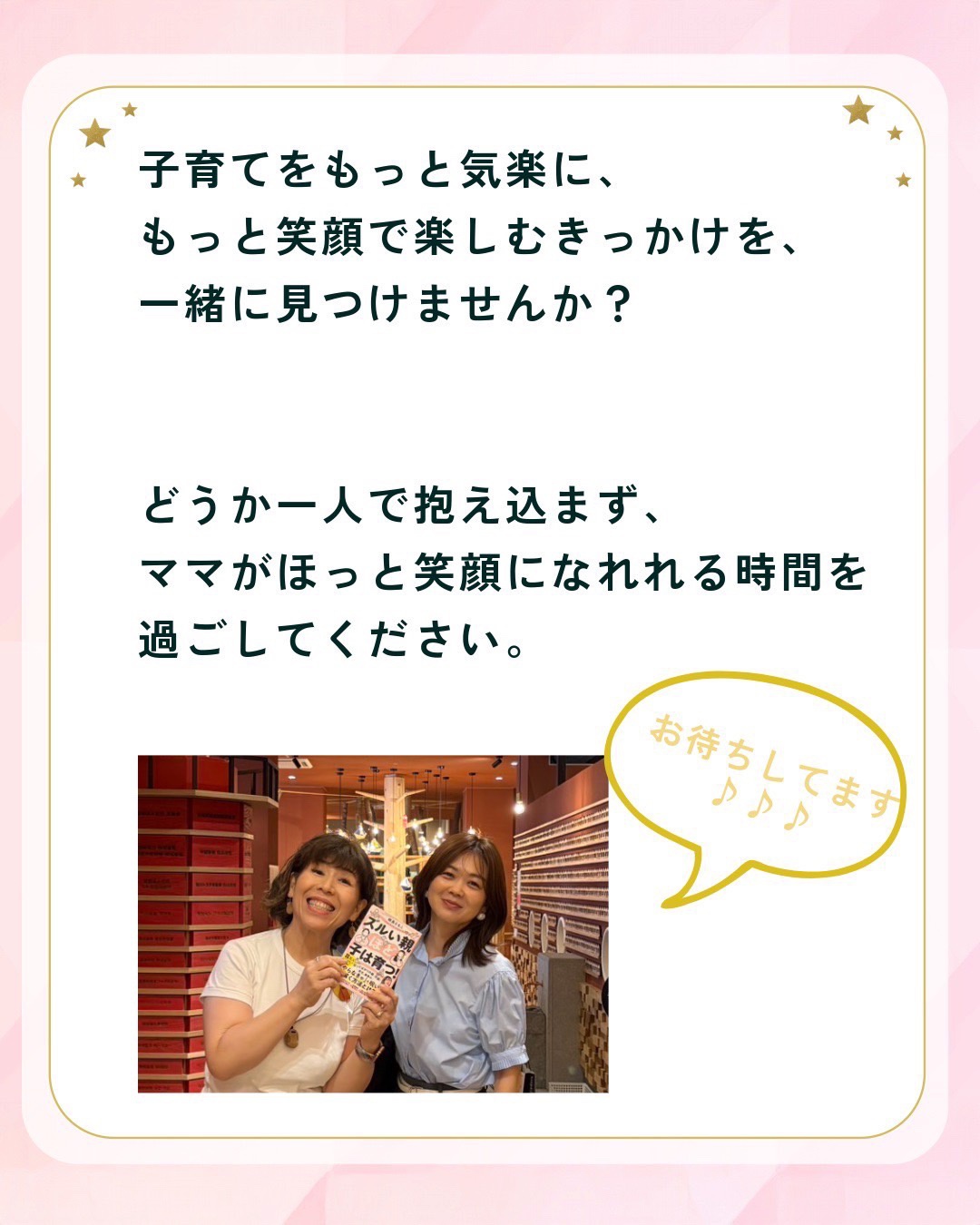 子育てをもっと気楽に、もっと笑顔で楽しむきっかけを、一緒に見つけませんか?どうか一人で抱え込まず、ママがほっと笑顔になれる時間を過ごしてください。