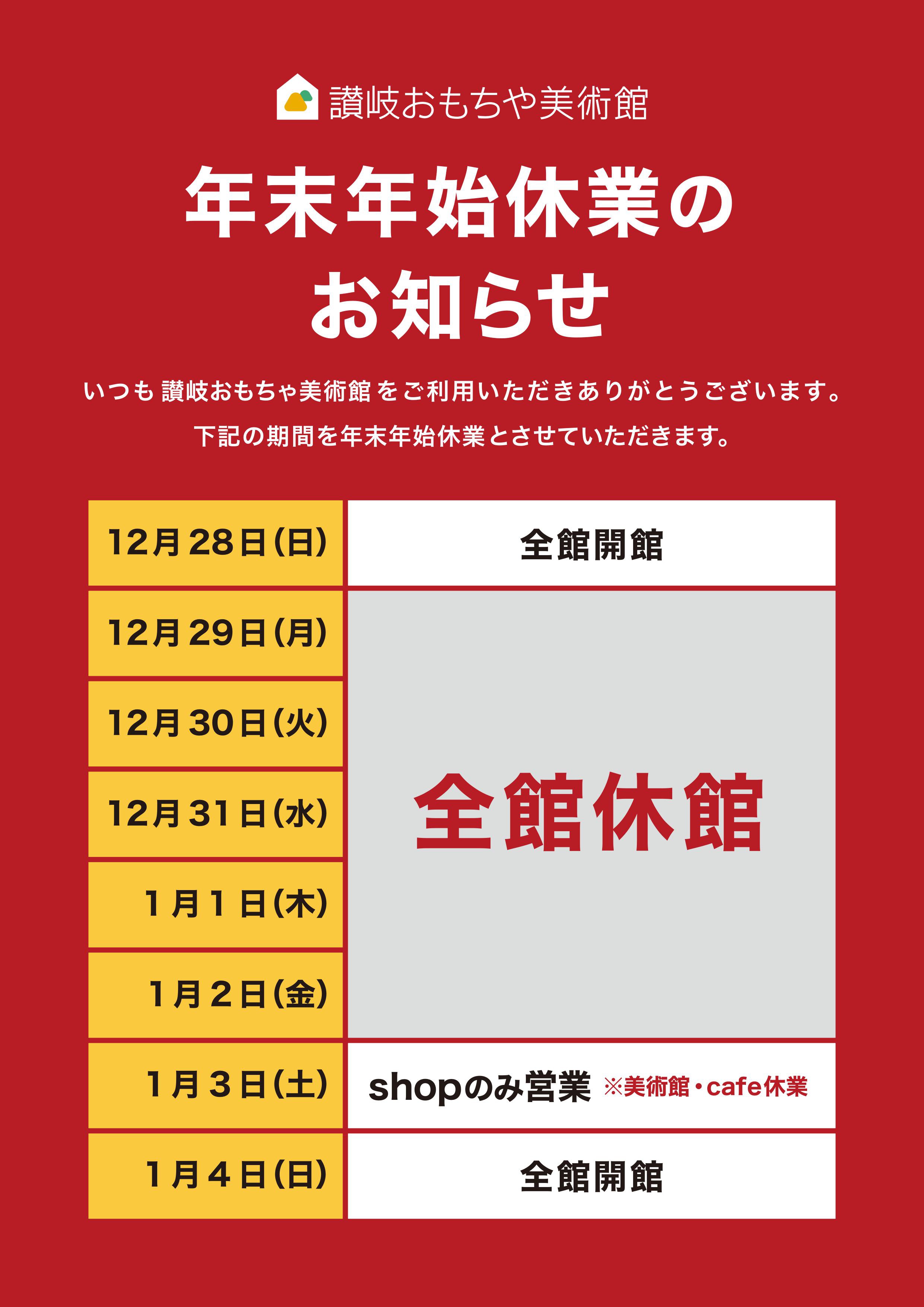 いつも讃岐おもちゃ美術館をご利用いただき誠にありがとうございます。 年末年始の営業日を上記のとおりとさせていただきます。 ご不便をおかけいたしますが、何卒よろしくお願い申し上げます。 続きを見る