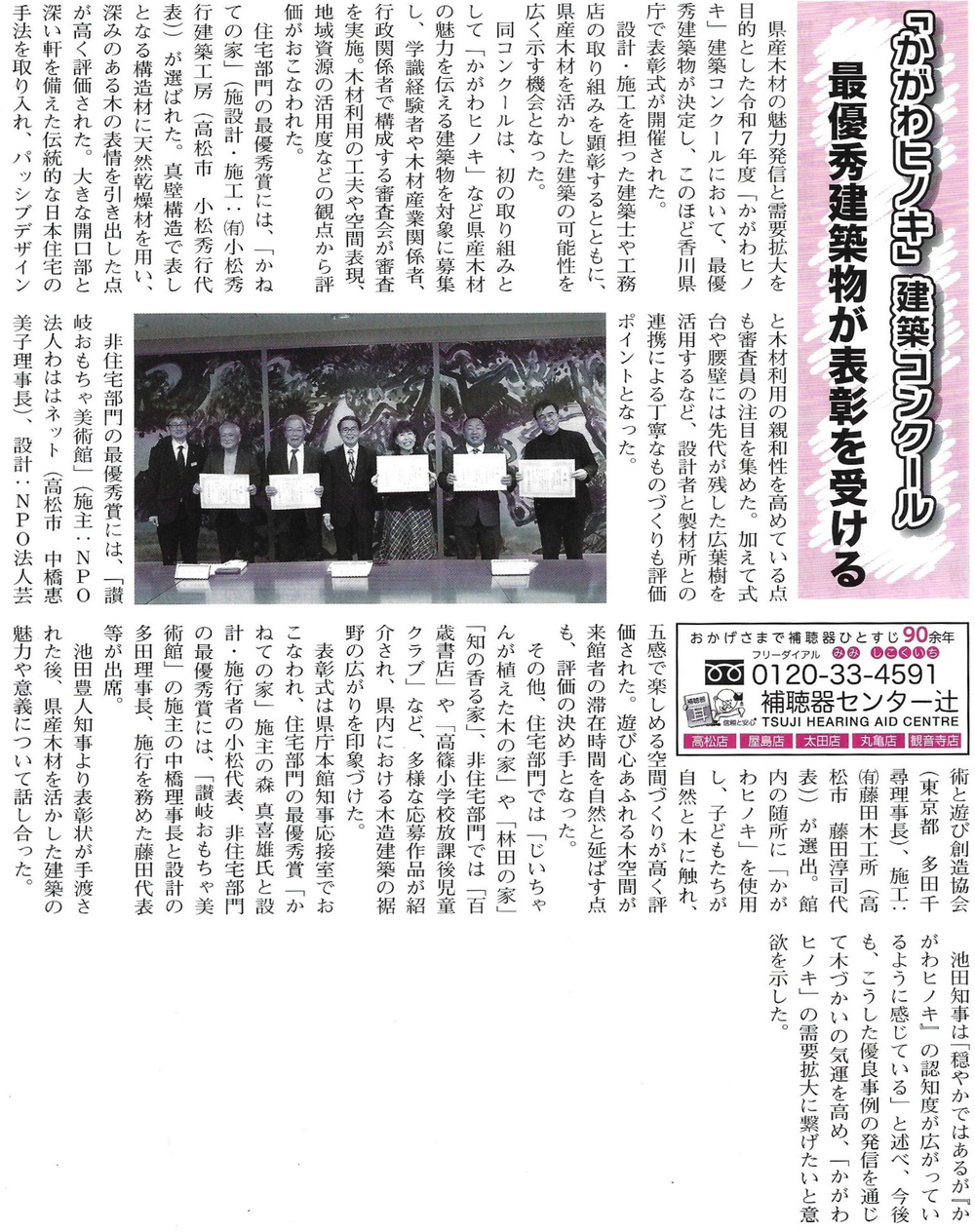 讃岐おもちゃ美術館が、令和7年度「かがわヒノキ」建築コンクールの非住宅部門で、最優秀賞に選ばれ 設計者である 特定非営利活動法人 芸術と遊び創造協会 施工いただいた 有限会社 藤田木工所 とともに、 2月6日...続きを見る