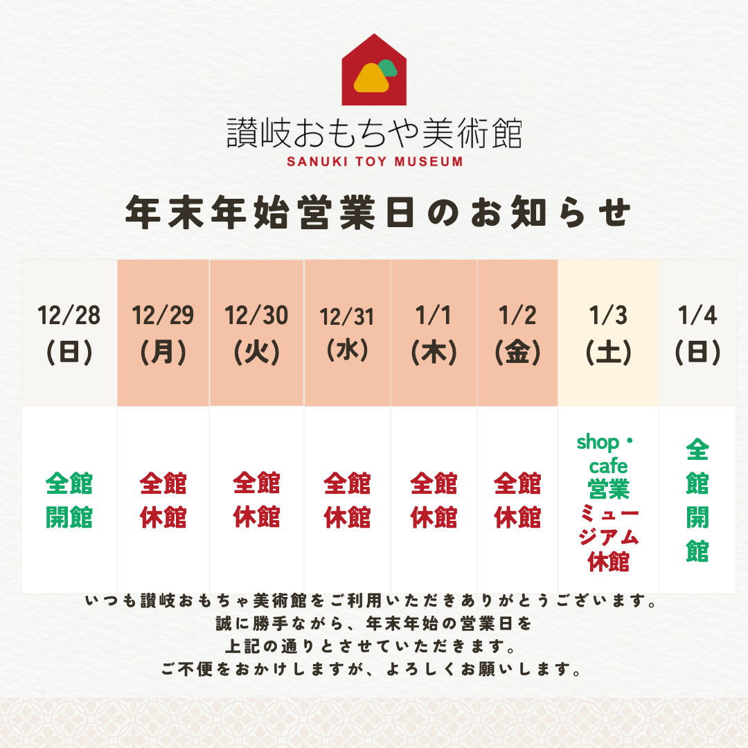【お知らせ】年末年始営業日のお知らせ いつも讃岐おもちゃ美術館をご利用いただき誠にありがとうございます。 年末年始の営業日を上記のとおりとさせていただきます。 ご不便をおかけいたしますが、何卒よろしくお願い申し上げます。 facebook twitter line
